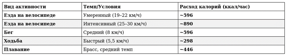 Велосипед — один из лидеров по сжиганию калорий, при этом он значительно безопаснее для суставов, чем бег. По данным Harvard Health Publishing, человек весом около 70 кг за час сжигает: