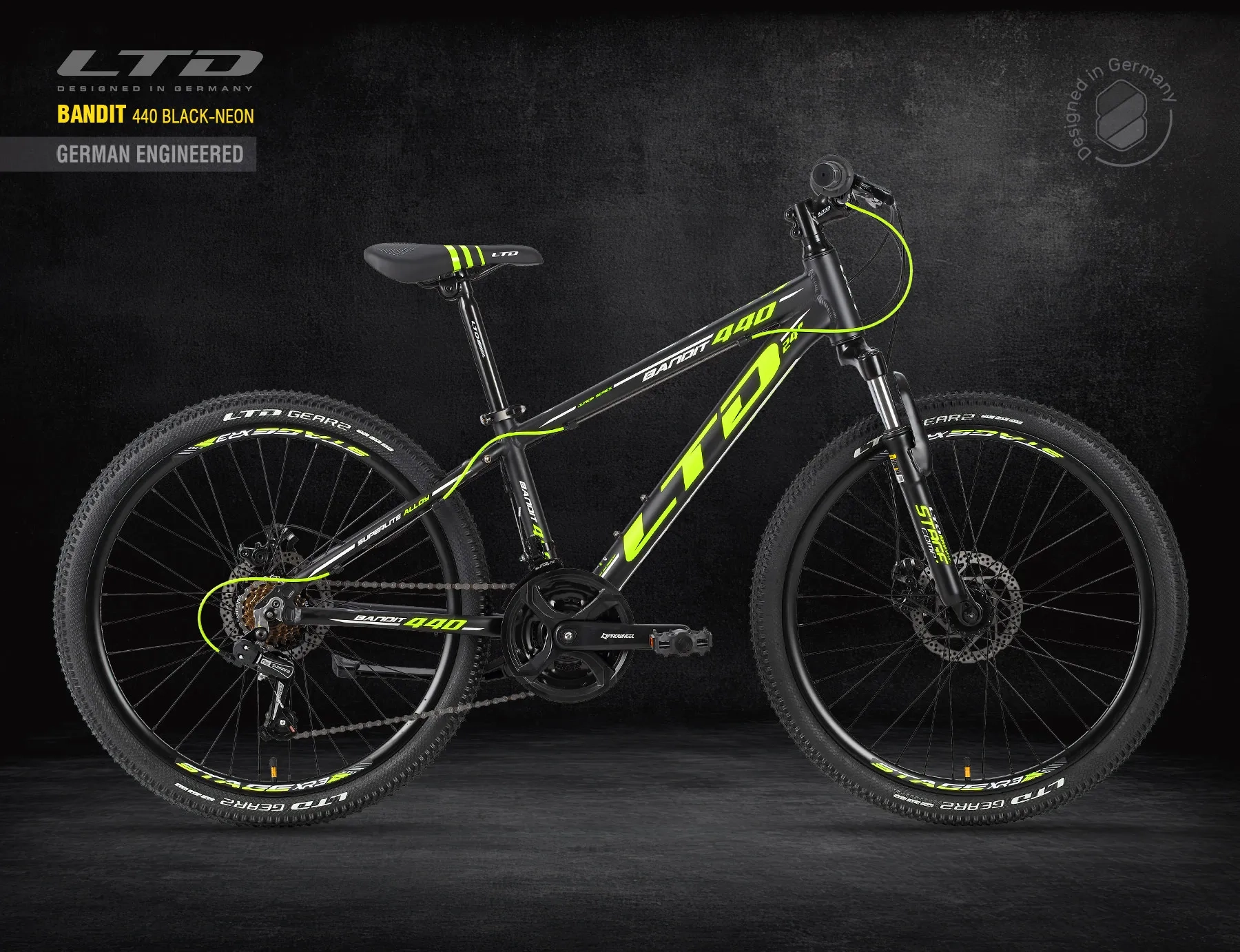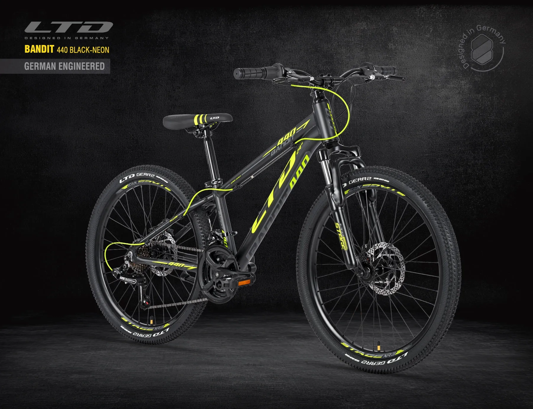 Новый велосипед LTD BANDIT 440 BLACK-NEON 24″- это уменьшенная копия настоящего горного велосипеда для начинающего байкера 7-14 лет.